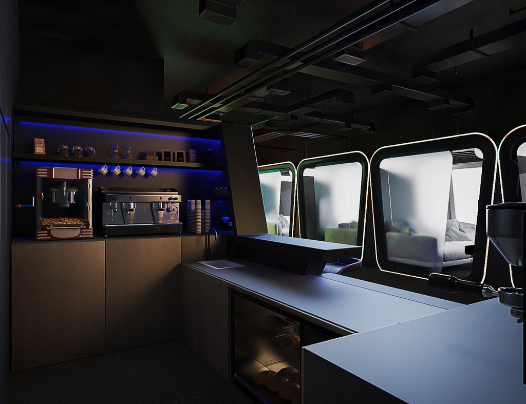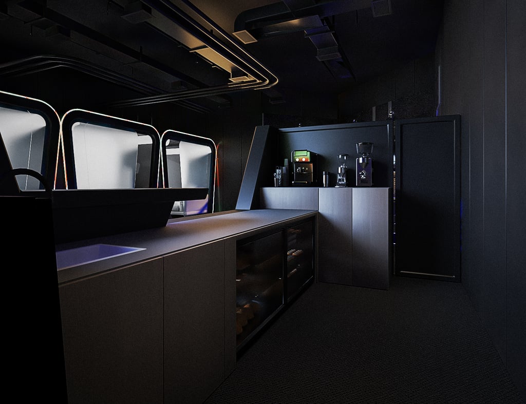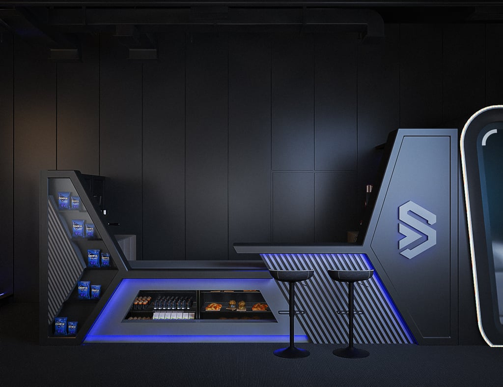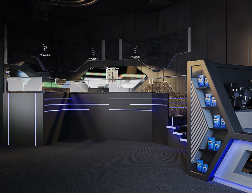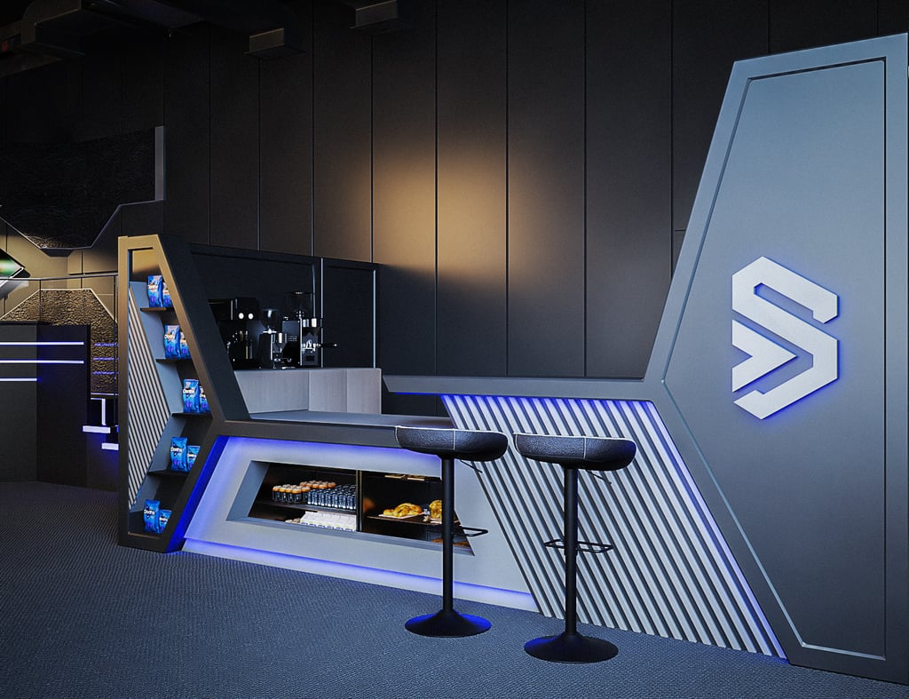 So we designed this bar to look as gaming as possible, with straight, angled lines, sharp angles and LED lights to complete the look. With that we checked all the boxes that were set for this design .