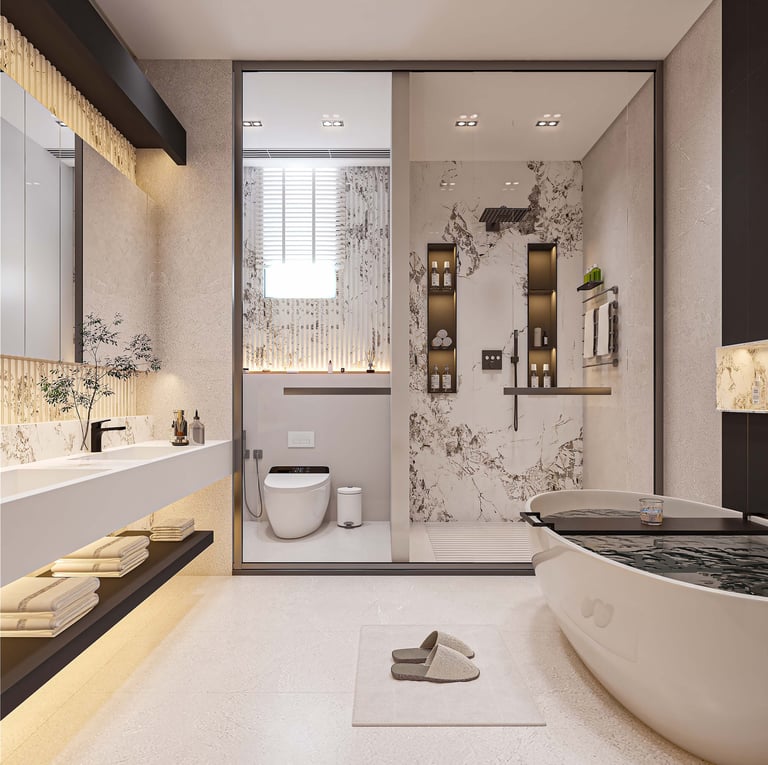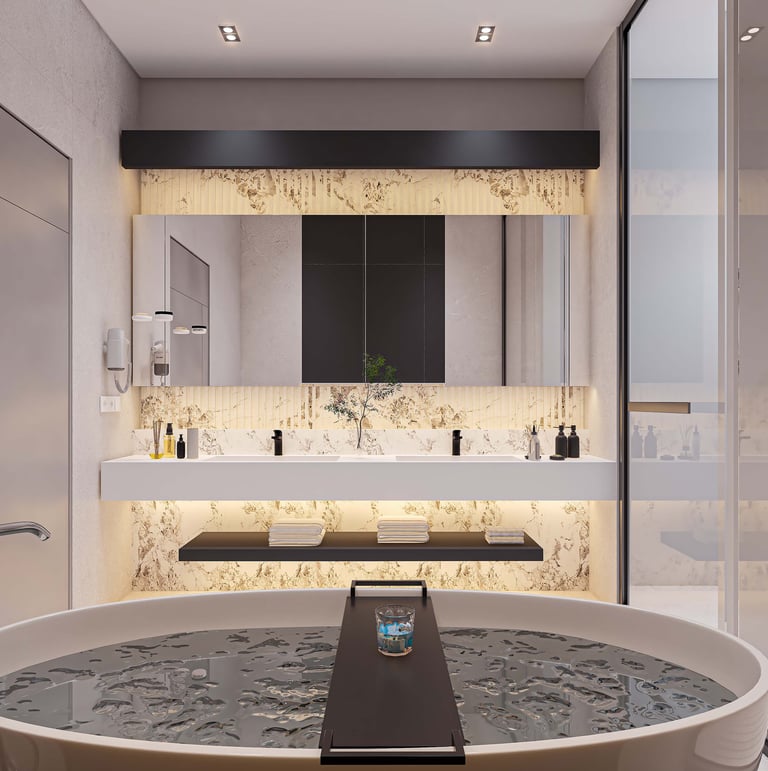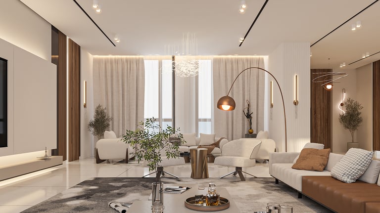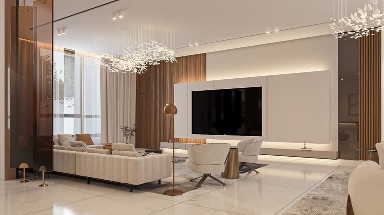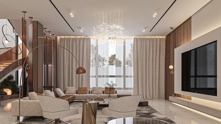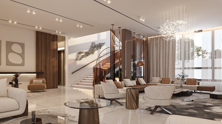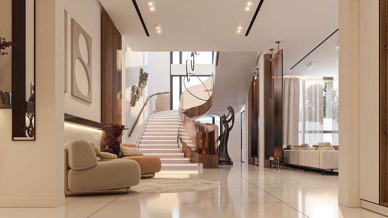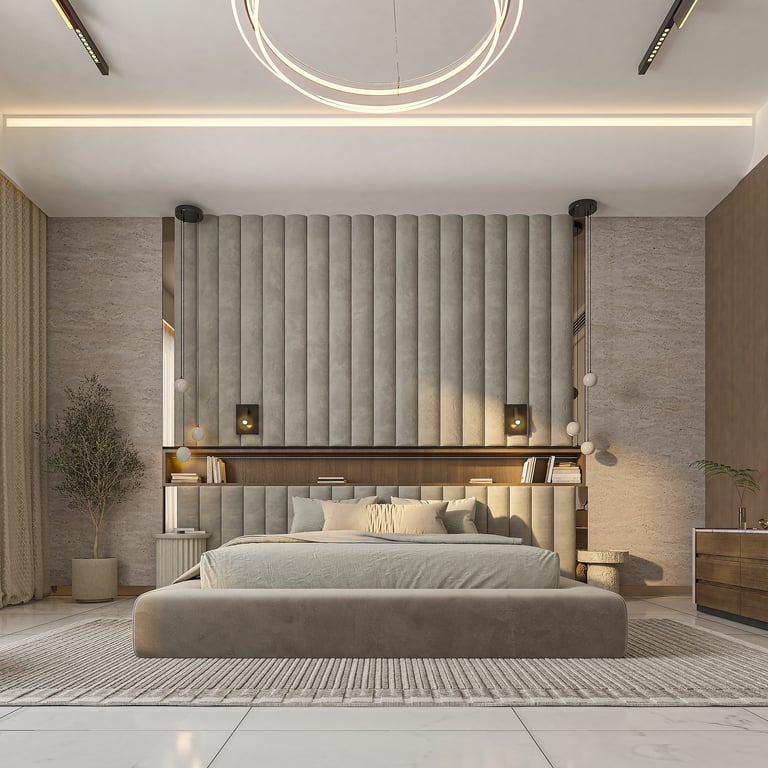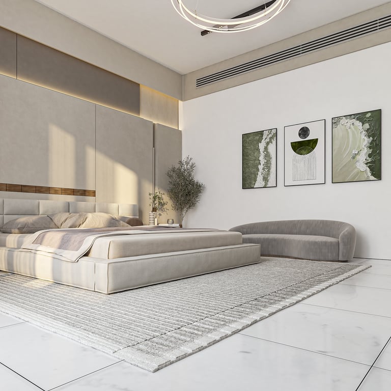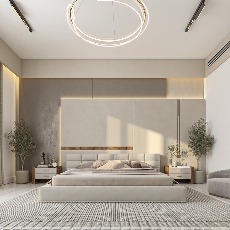 The villa is designed on two levels. The ground floor includes a majlis, a guest corner, a living and dining area connected to the kitchen, as well as a guest bedroom, a gym, and a private cinema. In addition, the floor accommodates the servants’ quarters and their service facilities.