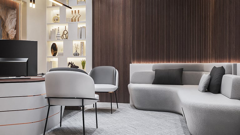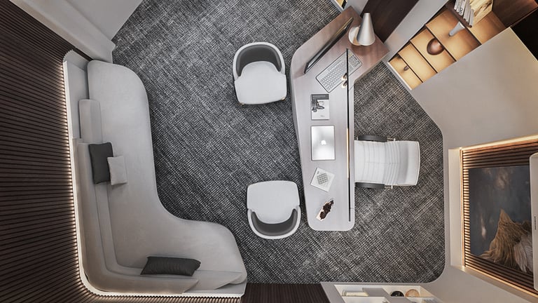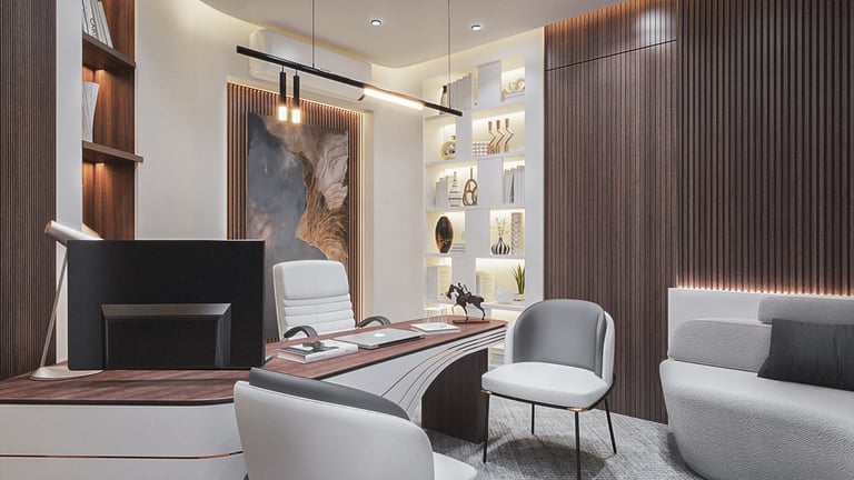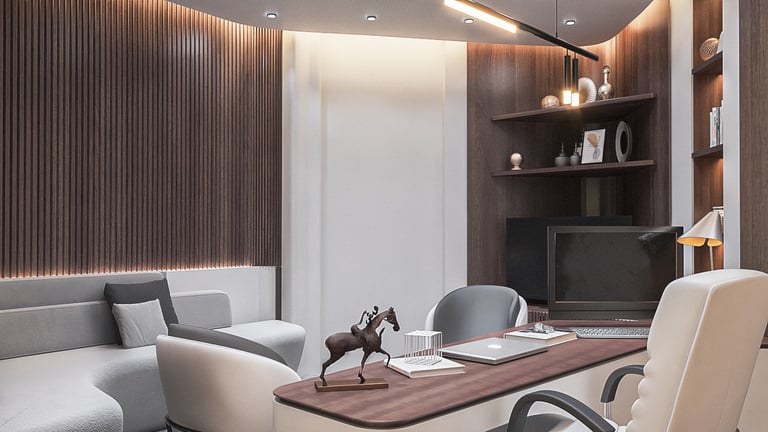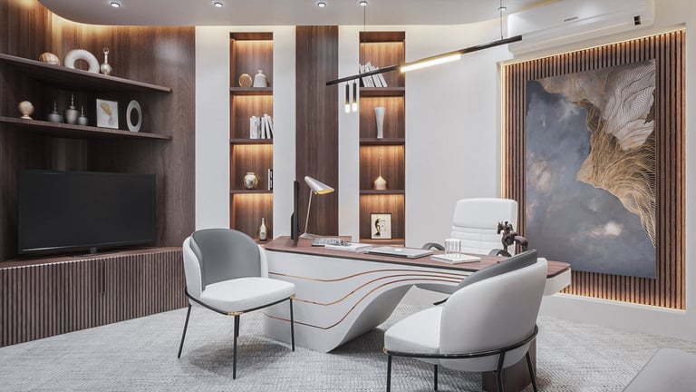 On an area of 15 square meters, it was requested to design an office that looks luxurious in a modern style using light colors.